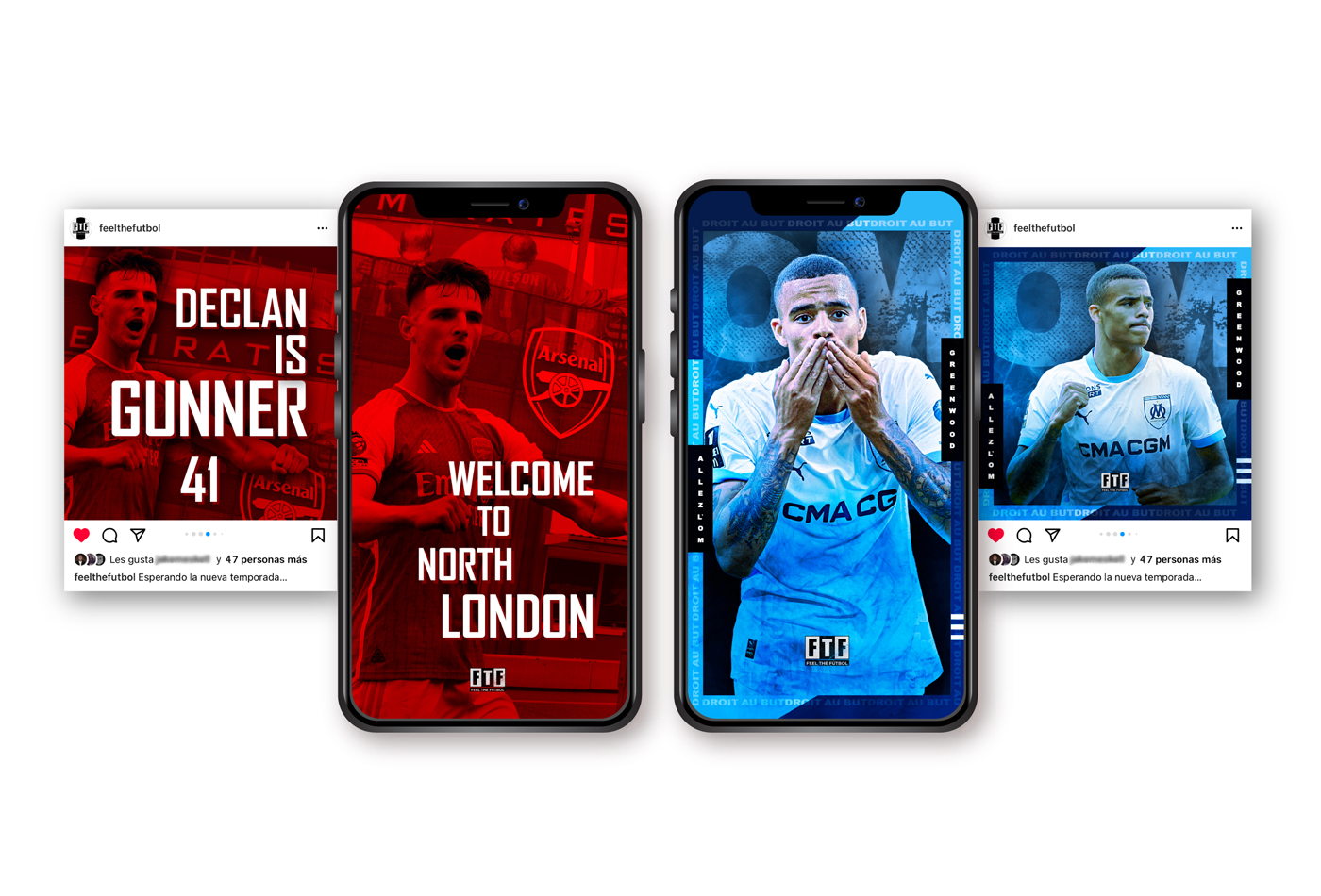 Diferentes creatividades desarrolladas para las redes sociales de Feel The Fútbol, realizadas en Adobe Photoshop. En este caso, piezas dedicadas a Declan Rice y Mason Greenwood.
